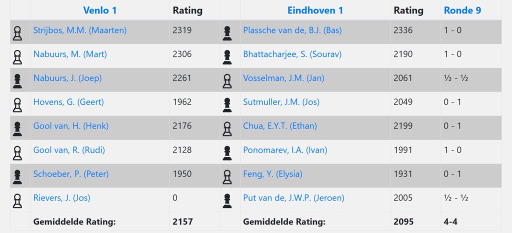 Zaterdag 11 maart 2026 eindigde de thuiswedstrijd tussen team Venlo 1 (KNSB) en Eindhoven 1 in 4-4.