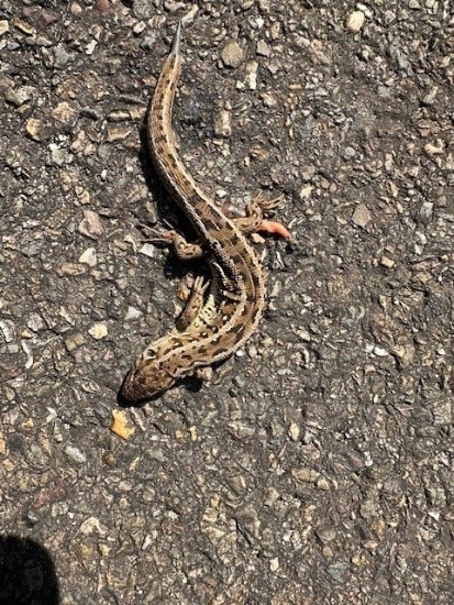 Het betrof een vrouwtjes zandhagedis. Zwaargewond. Hier hielp zelfs geen autotomie meer aan… Snik…