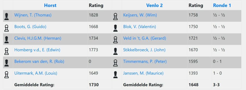 Venlo 2 speelde uit tegen Horst 1 gelijk met 3-3. Een verdienstelijk resultaat tegen een team dat vorig jaar nog een klasse hoger speelde. Zie hieronder de persoonlijke resultaten.