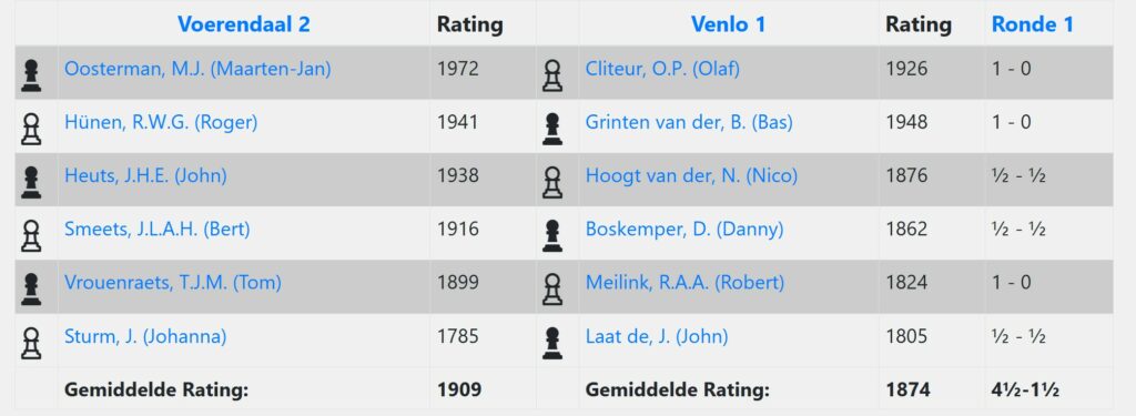 Venlo 1 verloor in de Hoofdklasse roemloos met 4,5 – 1,5 van Voerendaal 2, waar vorig jaar nog met dezelfde cijfers van gewonnen werd. Zie hieronder de persoonlijke resultaten.