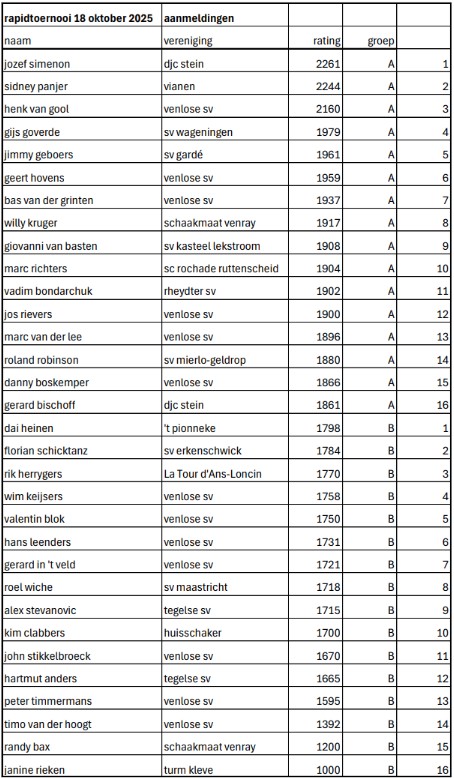 Deelnemerslijst ‘Stadsherberg Ald Weishoes’ Rapid op 18 oktober a.s.: NaamVerenigingRatingGroep jozef simenon djc stein 2261 A jimmy geboers sv gardé 1961 A geert hovens venlose sv 1959 A bas van der grinten venlose sv 1937 A marc richters sc rochade ruttenscheid 1904 A vadim bondarchuk rheydter sv 1902 A danny boskemper venlose sv 1866 A gerard bischoff djc stein 1861 A peter van dinteren huisschaker 1800 A dai heinen ’t pionneke 1798 B florian schicktanz sv erkenschwick 1784 B wim keijsers venlose sv 1758 B simon pendzich tegelse sv 1734 B hans leenders venlose sv 1731 B gerard in ’t veld venlose sv 1721 B alex stevanovic tegelse sv 1715 B kim clabbers huisschaker 1700 B john stikkelbroeck venlose sv 1670 B hartmut anders tegelse sv 1665 B peter timmermans venlose sv 1595 B timo van der hoogt venlose sv 1392 B